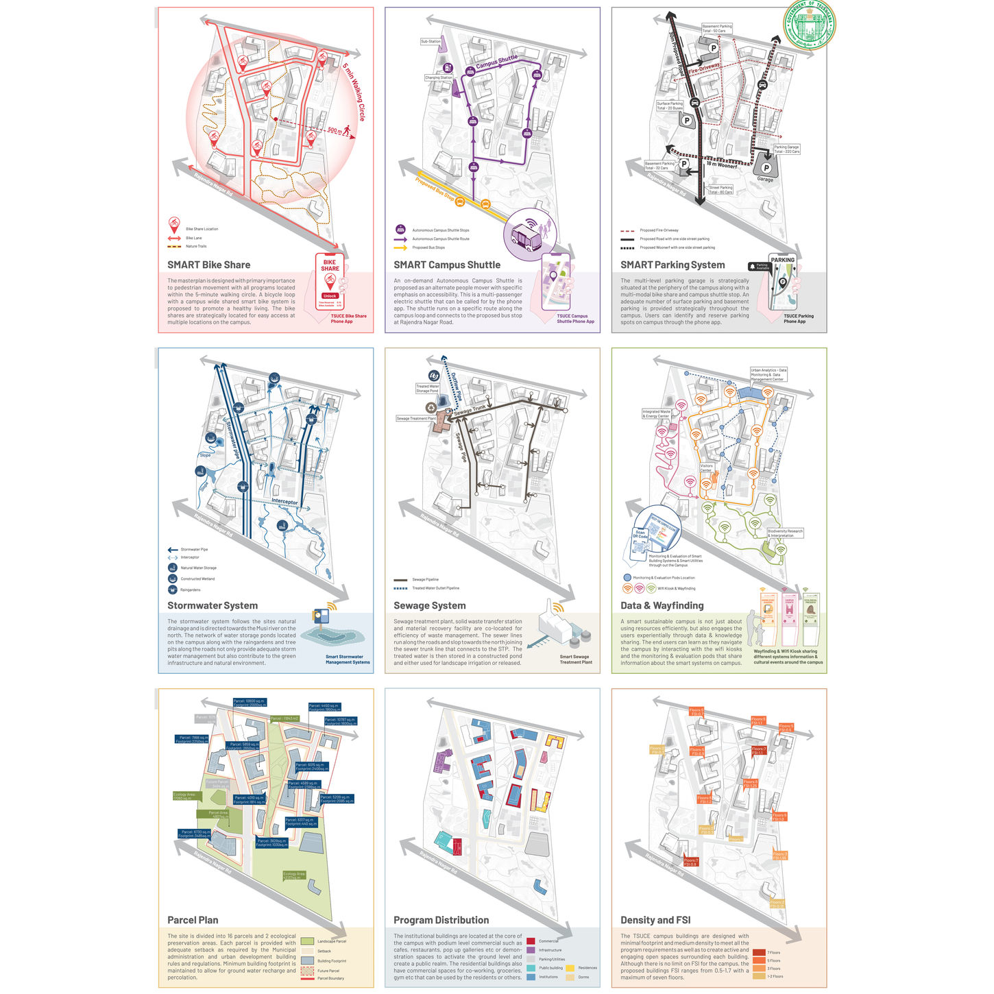 Our vision for TSUCE supports a multi-disciplinary, integrated, and hands-on curriculum with research, learning, and incubator spaces where future urban leaders can guide India’s urbanization to be “smart” in a holistic sense. The campus serves as a demonstration space for “smart” integrated urban planning with new models of affordable housing, sustainable mobility, blue-green infrastructure, responsive systems, and vibrant public spaces. The masterplan envisions five districts that replicate a livable and walkable urban neighborhood: Mixed-use Innovation District at the heart of the campus with multi-functional open spaces; Cultural District as a gateway to the campus with an iconic hotel and convention center; Ecological Preserve as an urban ecological landscape; Residential District as a model community with multiple housing typologies, and the Infrastructure District as a laboratory for innovative and circular urban systems. These districts are connected by a highly walkable and bikeable Campus Loop that fosters exploration and collaboration. The buildings, landscape, and infrastructure systems facilitate circular flows of energy, food, waste, and water to make the campus self-sufficient.