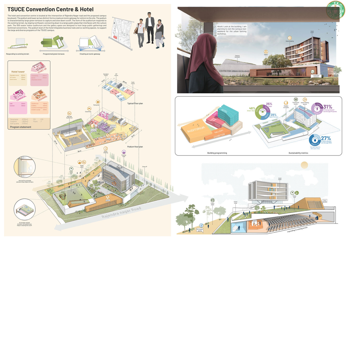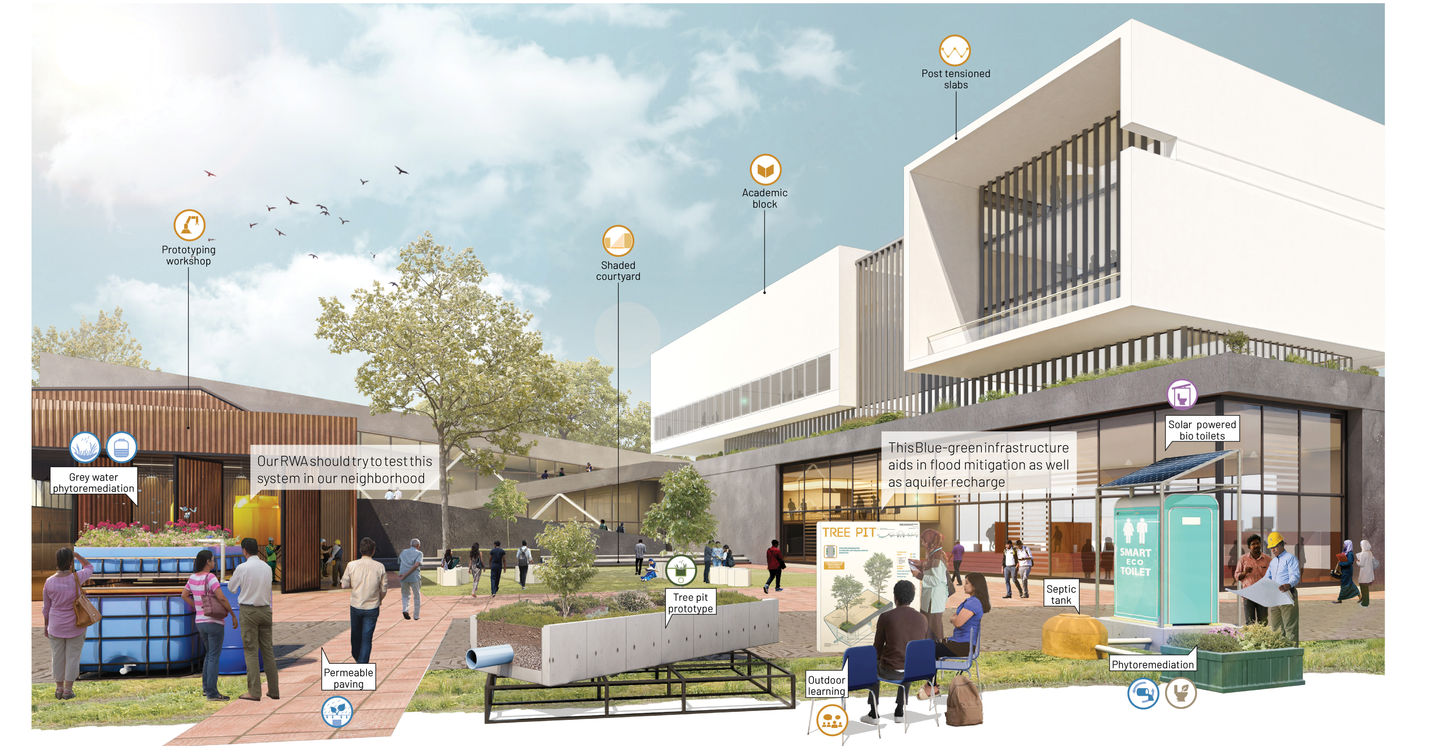Within the campus, six academic buildings house the following specialized departments: Ecology and Environment, Economics & Real Estate, Mobility & Transportation, Infrastructure & Services, Analytics & Data, Housing & Building Technology. Each academic building is equipped with Learning, Research, Startup, Commercial, Exchange, and Demonstration spaces to make each department multi-faceted. To foster inter disciplinary learning and collaboration, research and training programs are instituted along cross-cutting themes like resilience, sustainability, governance, informality, inclusion, and smart cities. The campus masterplan and programming draw specialists from multiple disciplines to break out of their siloes and work collaboratively across sectors and scales. TSUCE will become an invaluable resource to help Telangana and India house all urban dwellers with dignity, make cities and towns more sustainable, and build resilience towards future challenges.